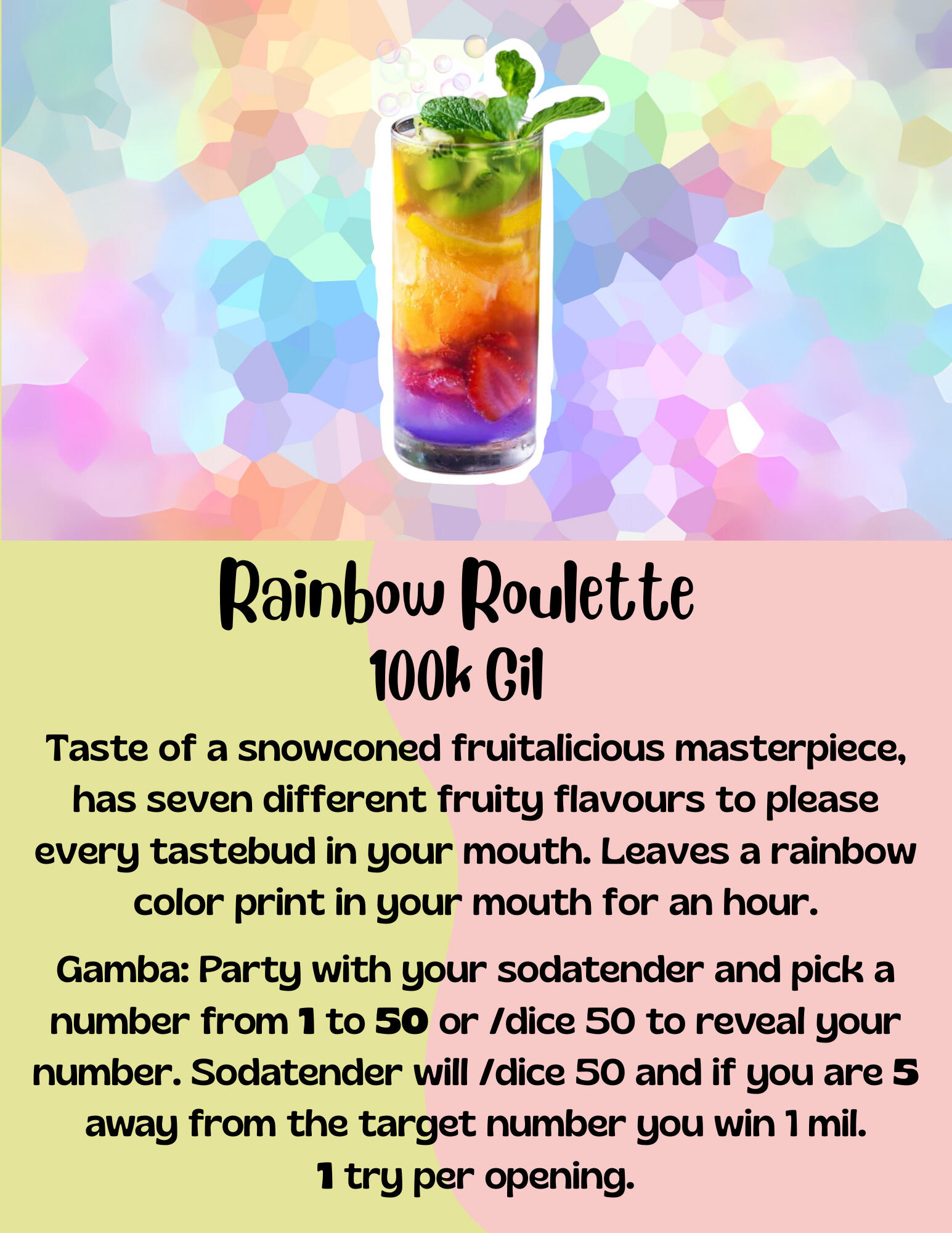When first starting up the soda shop, A'nos was inspired by bubbles, foam that washed up onto the beach. The noise it made crackled against the sand, he liked it a lot. When he learned that bubbles were formed with air and water, he had an idea! Why not make his own fruit juice syrups and combine it with carbonated water? As a successful idea came to life, his clan also gets the benefit of the profits. "A" clan can't get any better, with one Miqo'te man's dreams of the ocean to become a Soda Empire.- I based it on the late 50s or 60s where they had soda jerks who worked in soda shops. All they sold was brandless soda. Until the brands started coming in they were pushed outta work or pushed over the brandless sodas. Hang One, Freak, Natural, Brown... they are all REAL world words that they used back then. Same as "Snowball it" "Hold the Hail" etc. These were just the way of life back then. And naming my Sodatenders was better than Soda Jerks since honestly it is a really old term. -
