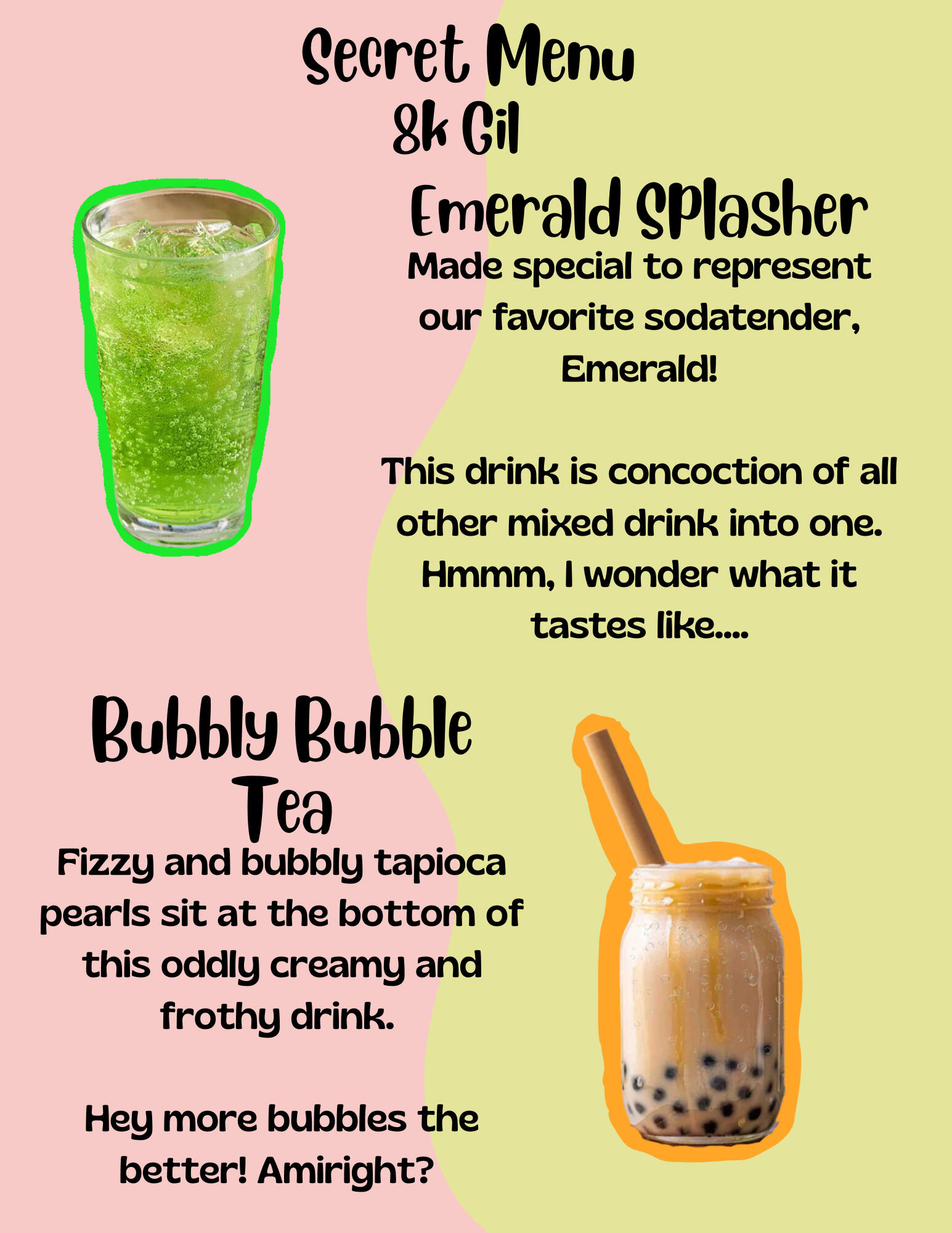 You found the Sodalicious Secret Menu!Now a few rules:1) Don't tell ANYONE! (Or try not to hehe)2) When you order off this menu, please DM your server or sodatender the item you wish to order.3) Have fun and this menu will always be in update. Congrats on being a cool kid!