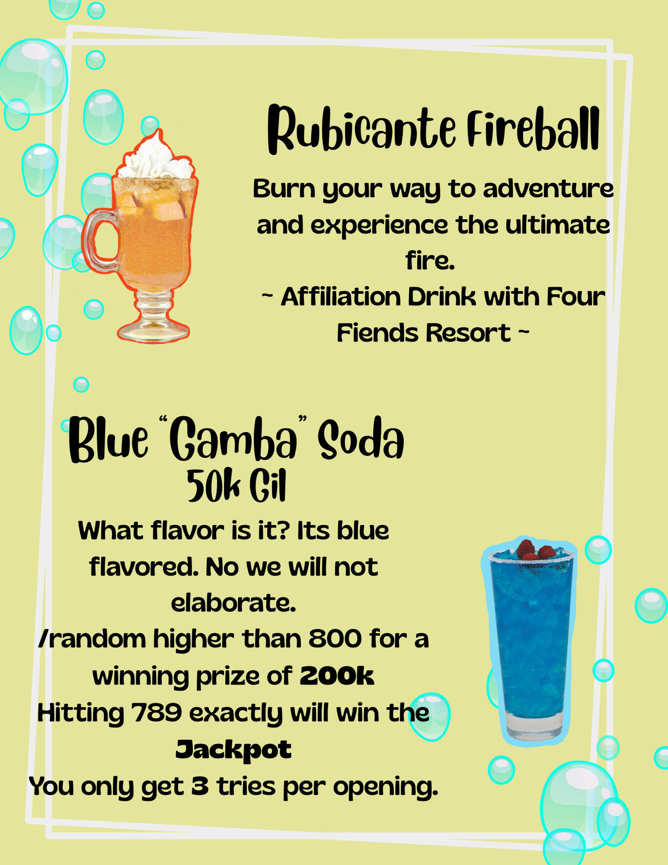 When first starting up the soda shop, A'nos was inspired by bubbles, foam that washed up onto the beach. The noise it made crackled against the sand, he liked it a lot. When he learned that bubbles were formed with air and water, he had an idea! Why not make his own fruit juice syrups and combine it with carbonated water? As a successful idea came to life, his clan also gets the benefit of the profits. "A" clan can't get any better, with one Miqo'te man's dreams of the ocean to become a Soda Empire.- I based it on the late 50s or 60s where they had soda jerks who worked in soda shops. All they sold was brandless soda. Until the brands started coming in they were pushed outta work or pushed over the brandless sodas. Hang One, Freak, Natural, Brown... they are all REAL world words that they used back then. Same as "Snowball it" "Hold the Hail" etc. These were just the way of life back then. And naming my Sodatenders was better than Soda Jerks since honestly it is a really old term. -